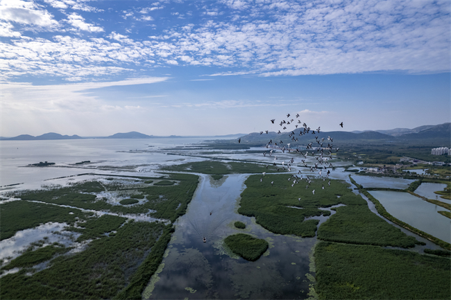 地遼天闊鳥競飛,平湖薄霧映晴暉。初冬時節(jié),東平湖迎來首批南遷候鳥,它們時而漫步淺灘,時而翱翔天際,動與靜、力與美交織,染就一幅舒朗壯麗的天然景象。